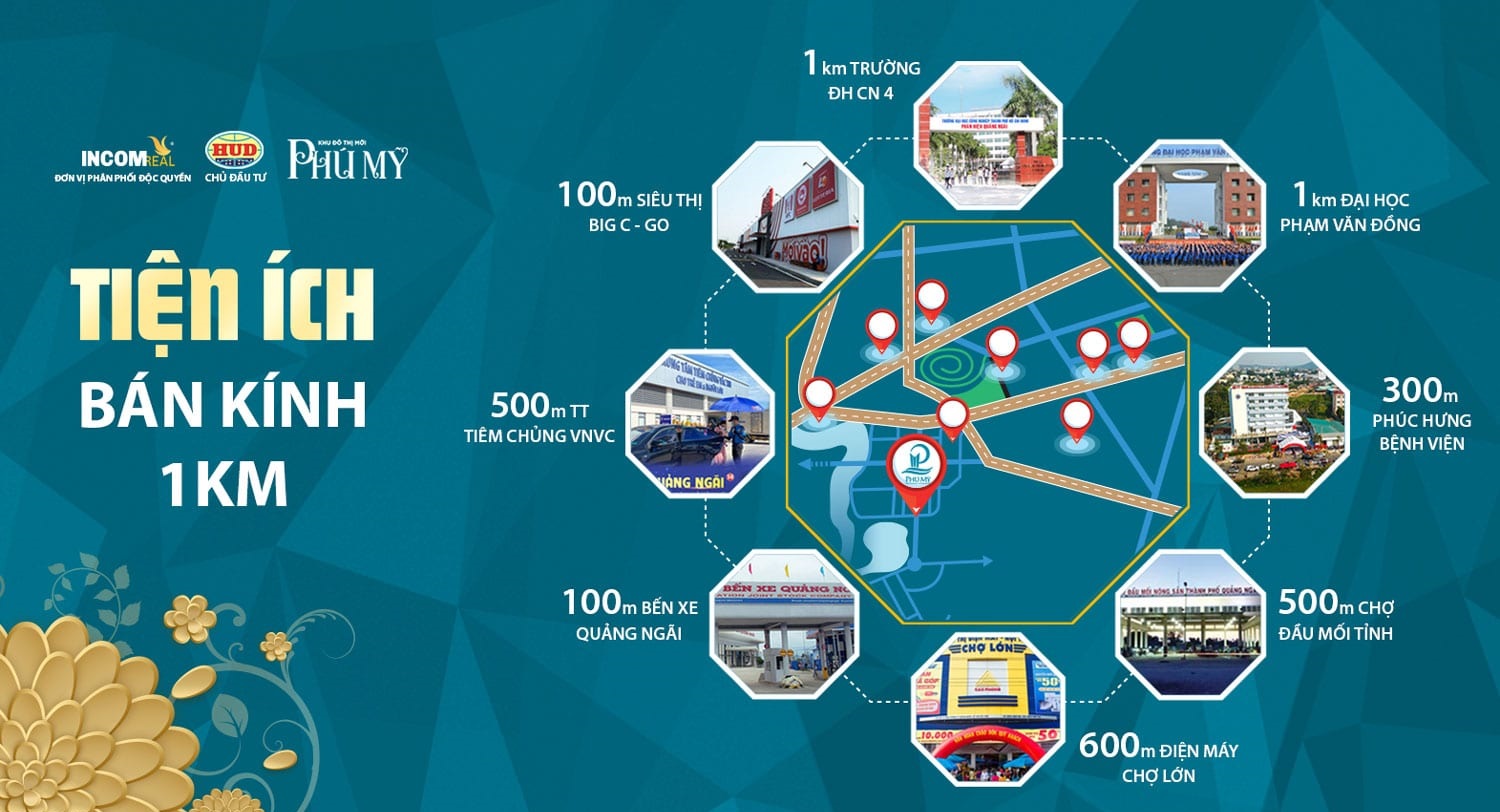 Trong vòng bán kính 3km xung quanh khu đô thị là hệ thống tiện ích ngoại khu toàn diện với chưa đầy 5 phút từ khu đô thị mới Phú Mỹ Quảng Ngãi bạn có thể di chuyển đến các địa điểm như: Nhà ga tỉnh Quảng Ngãi, đài phát thanh truyền hình, quảng trường thành phố, bệnh viện đa khoa tỉnh, bệnh viện đa khoa thành phố, bệnh viện Phúc Hưng, các siêu thị, trung tâm thương mại, trường đại học Phạm Văn Đồng, đại học Công Nghiệp, các trường học trong địa bàn thành phố, công viên Thiên Bút, công viên Ba Tơ…